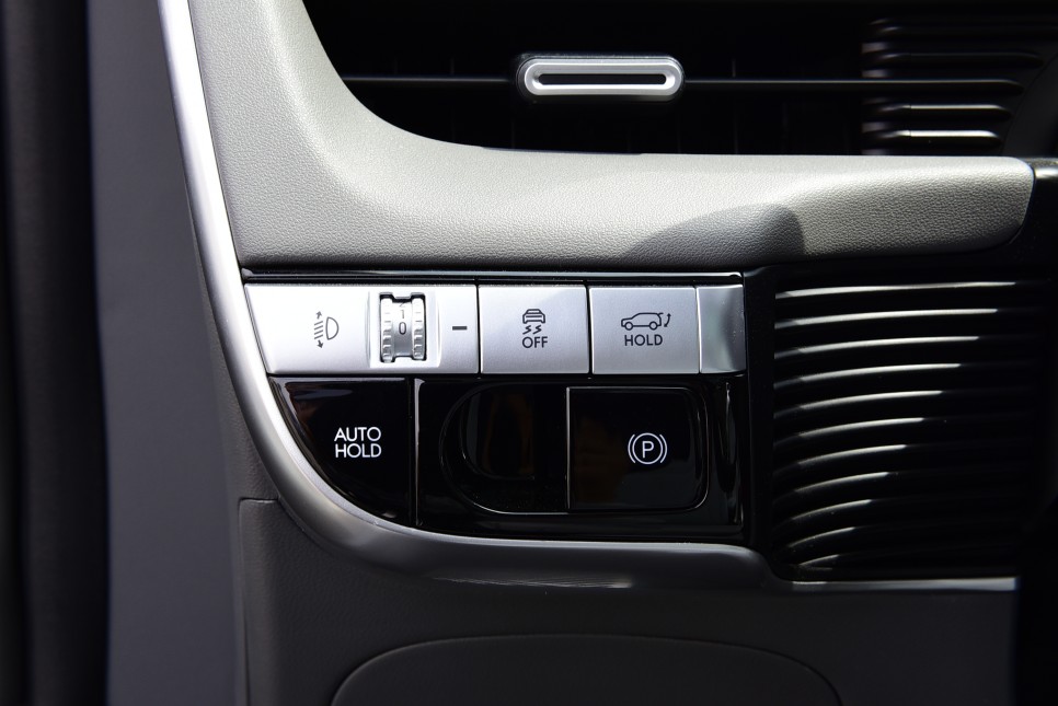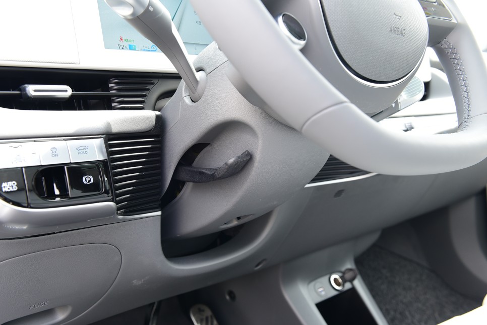조사각 조절과 전자식 파킹 브레이크 등이 깔끔하게 정돈되어 있습니다. 위치는 운전석 왼쪽입니다.