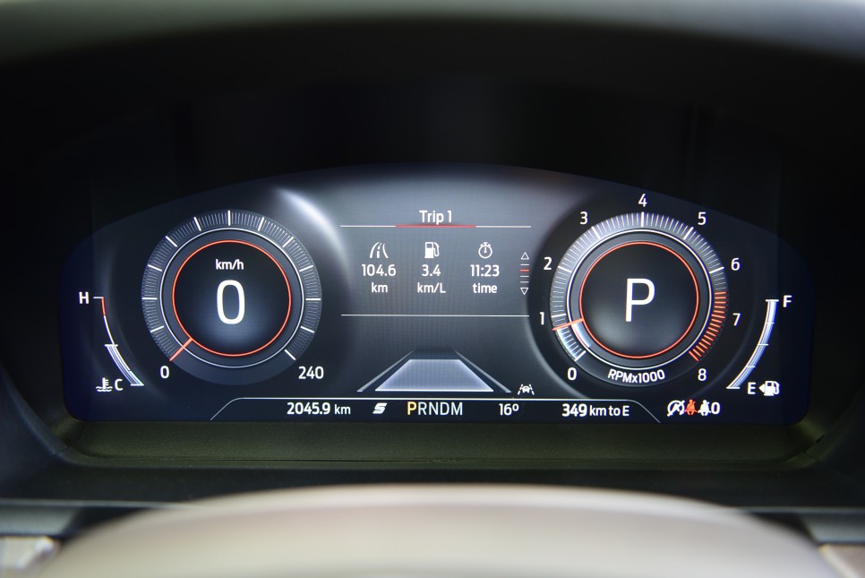에코 모드로 크루징을 하게 되면 고속도로에서 최고 연비는 13.2km/l, 반면 스포츠 모드로 도심에서 정체가 심할 때 최저 연비는 5.6km/l, 시승 동안 평균 연비는 7.8km/l을 확인할 수 있었습니다.
