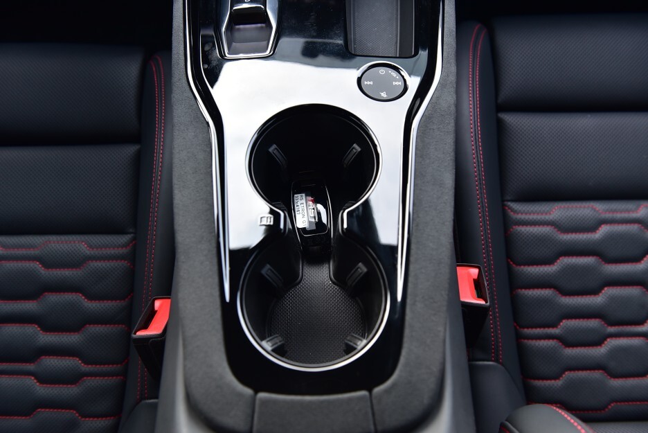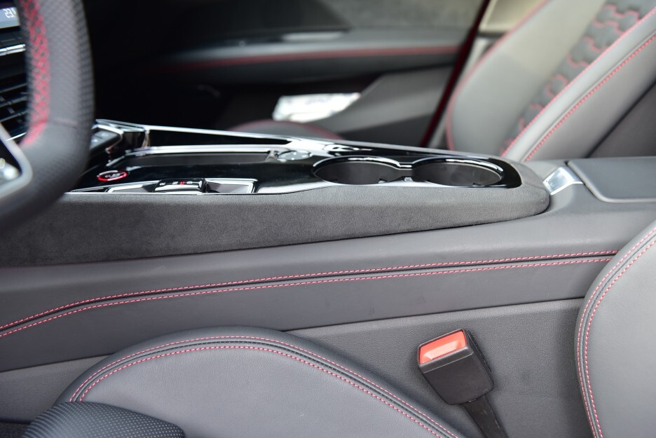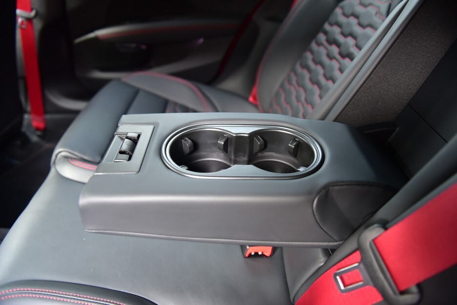 암레스트는 살짝 작은 편이었고 컵홀더는 오픈 타입으로 2개가 마련되어 있습니다. 주변에 찍힌 안전벨트를 보니 역시나 센스 있게 강열한 레드죠!!